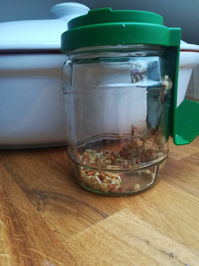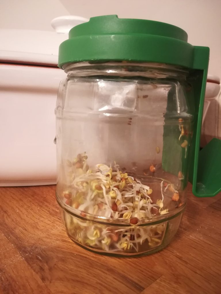 Sprossenziehen ist mit solch einem Glas super einfach und es geht sehr schnell. Es ist also auch für ungeduldige Menschen eine gute Variante. Um dauerhaft Sprossen zu haben, benötigt man wahrscheinlich eher zwei Gläser.