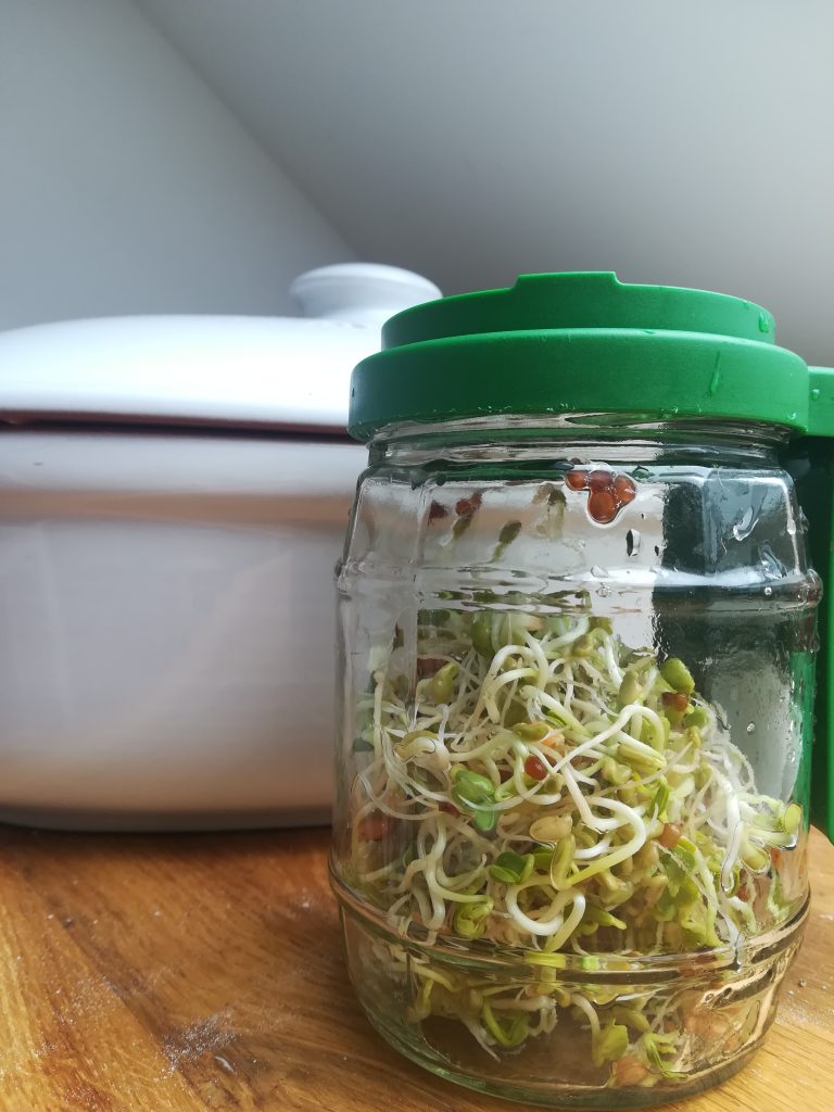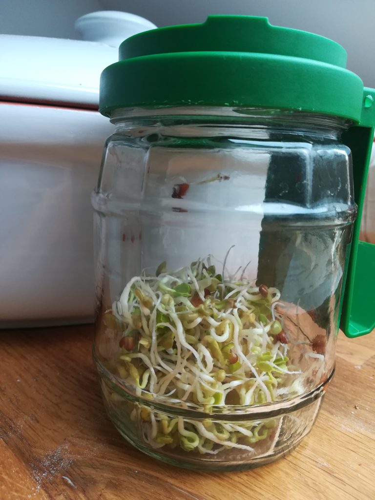 Sprossen werden einfach aus Samen gezogen. Ich habe eine Samenmischung aus Linsen, Bochshornklee und Rettich mit dem oben abgebildeten Sprossenglas/Keimglas bekommen.